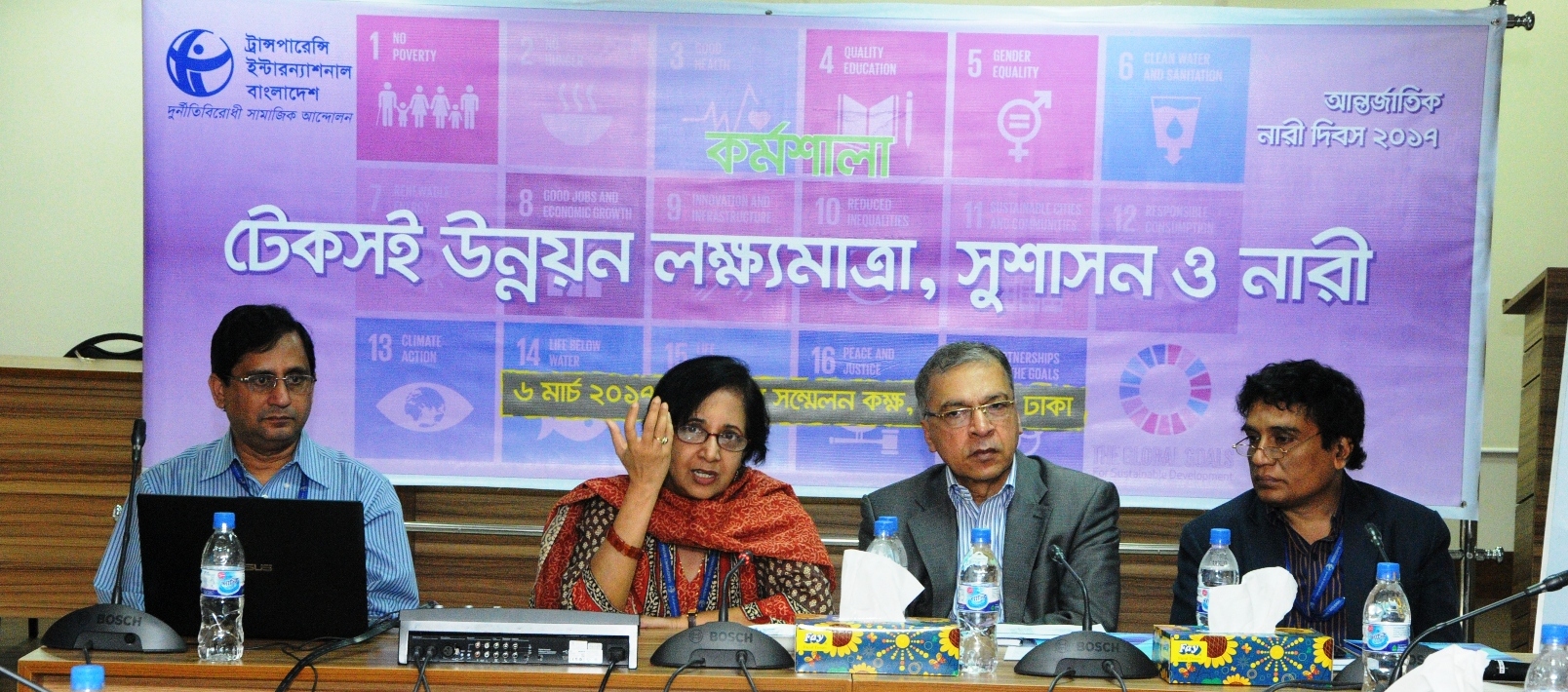 কর্মশালায় ‘টেকসই উন্নয়ন লক্ষ্যমাত্রা, সুশাসন ও নারী’ বিষয়ে উপস্থাপনা করেন টিআইবি’র আউটরিচ অ্যান্ড কমিউনিকেশন বিভাগের পরিচালক রিজওয়ান-উল-আলম। টেকসই উন্নয়ন নিশ্চিতে অন্তর্ভুক্তিমূলক কৌশলের ওপর অধিবেশন পরিচালনা করেন মানবাধিকারকর্মী অ্যাডভোকেট ইউ. এম. হাবিবুন নেসা। এসডিজি বিষয়ক উপস্থাপনার ওপর অংশগ্রহণকারীদের উন্মুক্ত আলোচনার পর ‘নারী অধিকার ও ক্ষমতায়ন প্রক্রিয়ায় সুশাসন: উপজেলা পর্যায়ে করণীয়’ বিষয়ের ওপর অংশগ্রহণকারী নারী কর্মকর্তাবৃন্দ দলগত কাজে অংশগ্রহণ করেন। দলগত কাজের ওপর সারমর্ম উপস্থাপন করেন টিআইবি’র উপ-নির্বাহী পরিচালক অধ্যাপক ড. সুমাইয়া খায়ের। সমাপনী পর্বে অংশগ্রহণকারীদের মধ্যে সনদপত্র বিতরণ করেন টিআইবি’র নির্বাহী পরিচালক ড. ইফতেখারুজ্জামান।