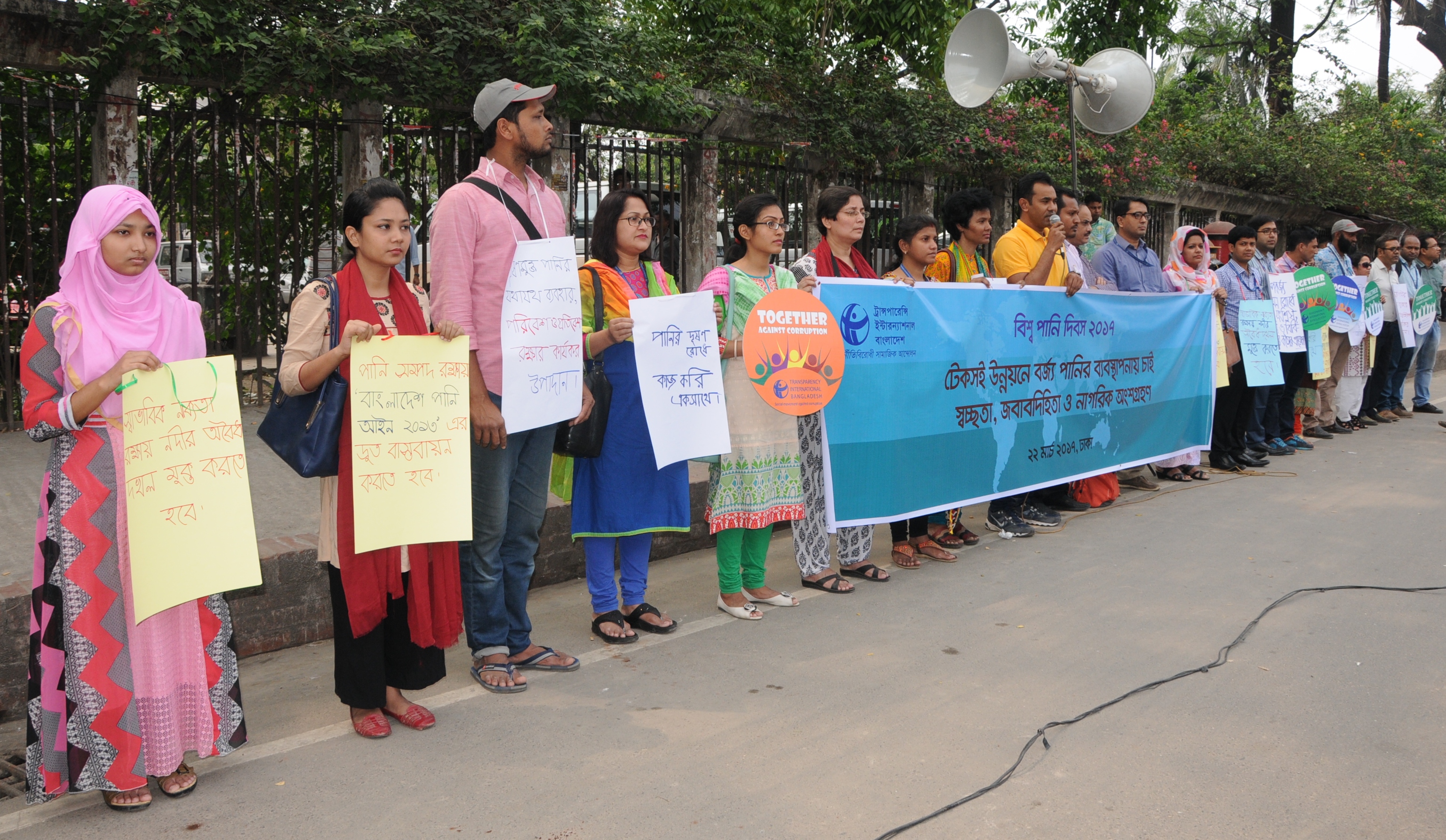 মানববন্ধনে বক্তারা বলেন, পানি সম্পদ ব্যবস্থাপনায় দুর্নীতি বাংলাদেশের পানিখাতে সমস্যার অন্যতম প্রধান কারণ। বাংলাদেশের ৮৭ শতাংশ জনগণের নিরাপদ পানীয় জলের উৎসে অভিগম্যতা রয়েছে বলে সরকারি পরিসংখ্যানে দাবি করা হলেও বাস্তবে অধিকাংশ নাগরিক নিরাপদ পানির অভাবে জনস্বাস্থ্য সংক্রান্ত বিভিন্ন দুর্ভোগের শিকার হচ্ছেন। প্রতি বছর বাংলাদেশের প্রায় ৭০ মিলিয়ন মানুষ নিরাপদ পানির অভাবে বিভিন্ন ধরণের পানিবাহিত রোগে আক্রান্ত হয়, এমনকি মৃত্যুও ঘটে। দ্রুত বর্ধনশীল জনসংখ্যা, অপরিকল্পিত নগরায়ণ ও শিল্পায়ন, অপরিকল্পিত পানি ব্যবস্থাপনা, জলবায়ু পরিবর্তনের নেতিবাচক প্রভাব প্রভৃতি বাংলাদেশের পানিখাতে সমস্যা বৃদ্ধির অন্যতম কারণ।