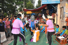 The improvised drama centers on land grabbing and occupying water bodies by powerful quarters in Dhaka metropolisThe connivance of the officials with the politically powerful and absence of rule of law, accountability and transparency in land sector was also depicted, much to the cheer of the crowd. |