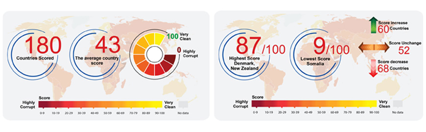 Produced by the Research team of TI-Secretariat and launched in 1995, the Corruption Perceptions Index, Transparency International’s flagship research product, has become the leading global indicator of public sector corruption. The index offers an annual snapshot of the relative degree of corruption by ranking countries and territories from all over the globe. CPI provides an international comparison of countries by perceived prevalence of corruption understood in terms of abuse of entrusted power. It is a survey of surveys (13 in 2019) conducted by reputed international organizations. Information used in CPI relates to corruption in the public sector, particularly political and administrative; conflict of interest; unauthorized payment in the delivery of government functions, and in the judiciary, executive, law enforcement and tax collection. The government's capacity to control corruption is also considered. In 2012, Transparency International revised the methodology used to construct the index to allow for comparison of scores from one year to the next.