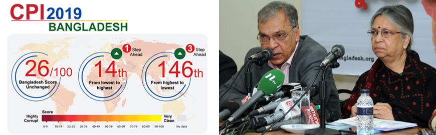 Bangladesh scored 26 out of 100 points and was ranked 14th from the bottom and 146th from the top among 180 countries in the Transparency International’s (TI) Corruption Perceptions Index (CPI) 2019. As per the latest CPI which ranks countries and territories by their perceived levels of public sector corruption each year, Bangladesh scored far below than the global average score (43) and its position remains 2nd lowest for the 7th consecutive years among eight South Asian countries- lower than all except Afghanistan. TI Bangladesh called upon the government to take more drastic and effective steps beyond pledges and short-term operations against corruption.