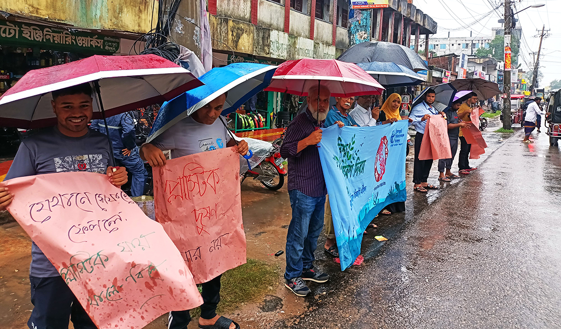 In addition to the clean-up drive, TIB’s volunteer network of students and committed citizens including Youth Engagement Support (YES), Active Citizens’ Group (ACG) and Committee of Concerned Citizens (CCC) respectively organized various awareness-raising programmes in 38 districts and 7 Upazilas of Bangladesh. Among them, defying full monsoon, the CCCs of Khagrachari, Sreemangal and Rangamati stood in a human chain while the CCC of Khulna visited the Deputy Commissioner’s office to submit a memorandum demanding effective measures against plastic pollution.