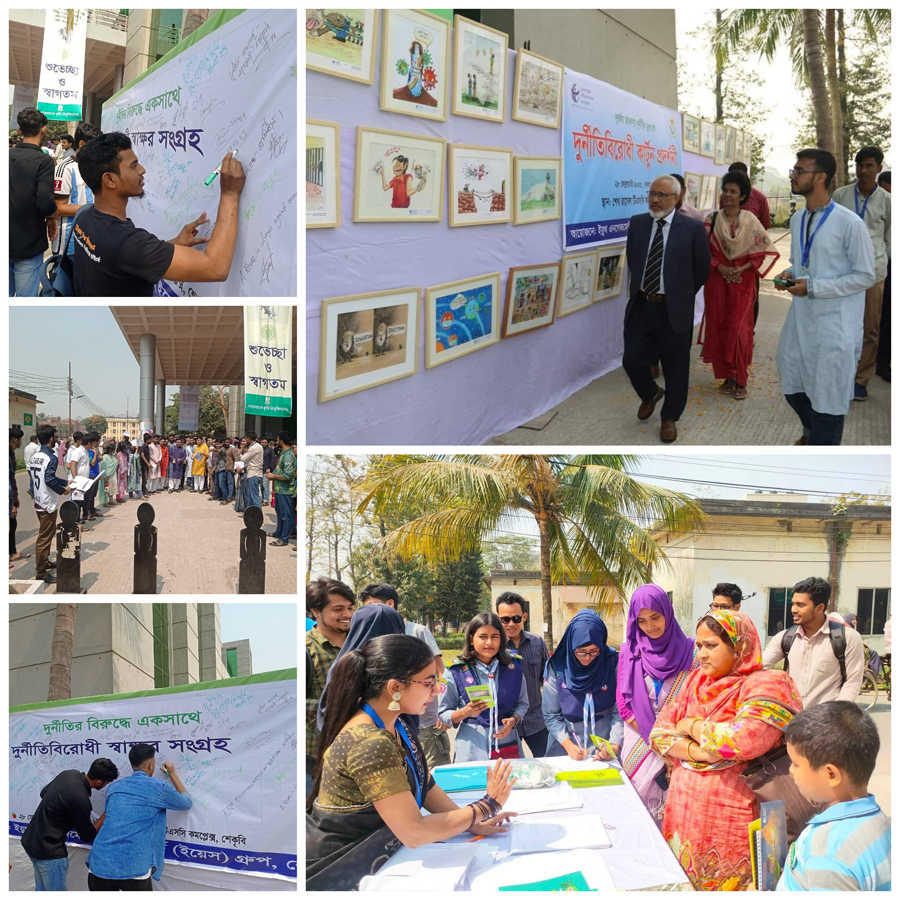 The YES group of Sher-e-Bangla Agricultural University organises different events at its campus on 28 February 2023 to create awareness against corruption among the students. The activities include-- Anti-Corruption Cartoon Exhibition, Anti-Corruption Signature Campaign, Anti-Corruption Game Show and Campaign on Right Information Act, 2009. The Cartoon Exhibition attracts over 200 students and teachers while the RTI campaign helps educate students on the Right to Information Act, 2009, and its application process.