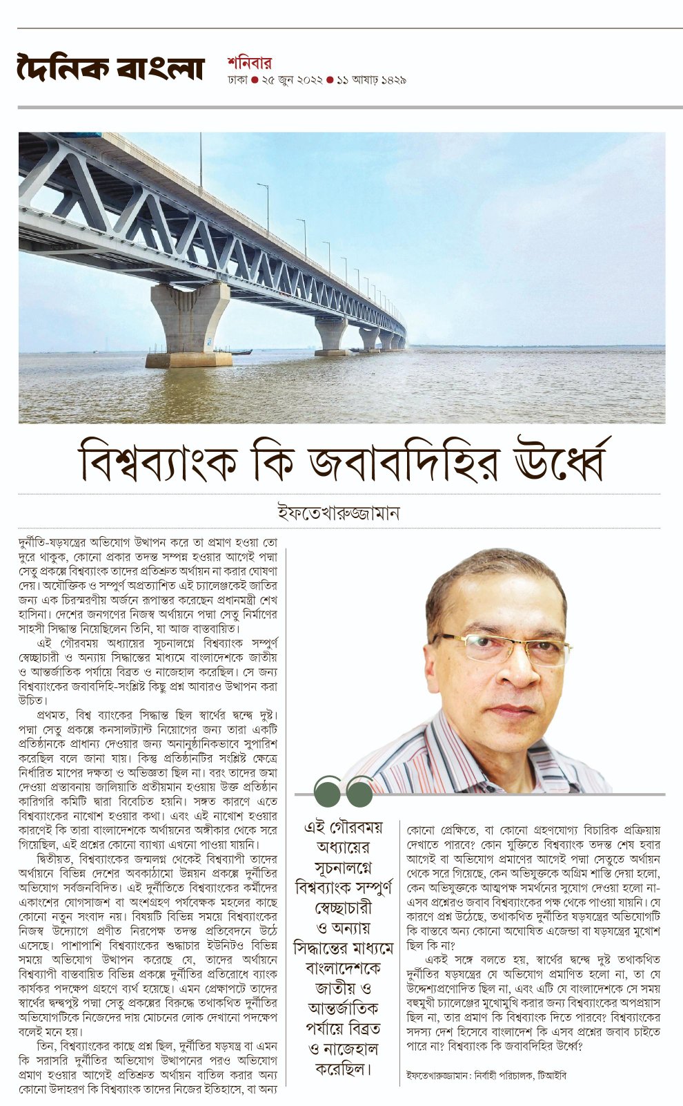 একই সঙ্গে বলতে হয়, স্বার্থের দ্বন্দ্বে দুষ্ট তথাকথিত দুর্নীতির ষড়যন্ত্রের যে অভিযোগ প্রমাণিত হলো না, তা যে উদ্দেশ্যপ্রণোদিত ছিল না, এবং এটি যে বাংলাদেশকে সে সময় বহুমুখী চ্যালেঞ্জের মুখোমুখি করার জন্য বিশ্বব্যাংকের অপপ্রয়াস ছিল না, তার প্রমাণ কি বিশ্বব্যাংক দিতে পারবে? বিশ্বব্যাংকের সদস্য দেশ হিসেবে বাংলাদেশ কি এসব প্রশ্নের জবাব চাইতে পারে না? বিশ্বব্যাংক কি জবাবদিহির উর্ধ্বে?