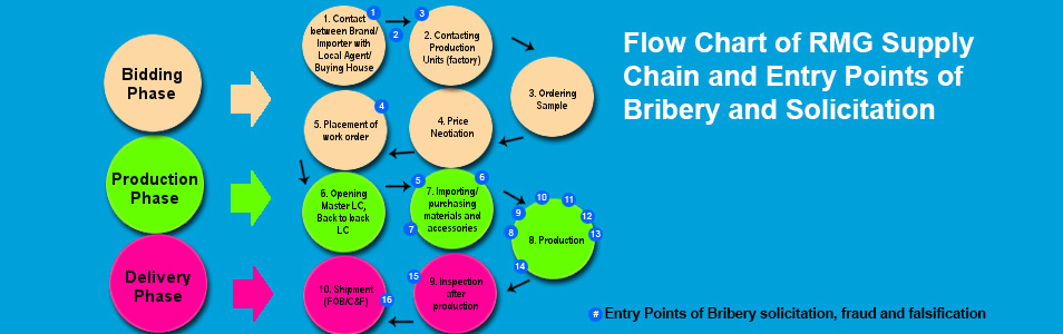 The last two year's positive developments included, among others, the formation of law, streamlining the safety and security standards, providing salaries as per wage board in 95% factories, issuance of identity cards by compliant factories, and Bangladesh Garment Manufacturers and Exporters Association (BGMEA)’s ‘Center of Excellence’ initiative to enhance workers’ awareness on fire safety, and surveys on around 67% factories to ensure fire, electrical and structural safeties by Accord and Alliance.Against this background, a joint TI-Bangladesh and TI-Germany study identified 16 real-life solicitation scenarios ranging from demands of extortion, fraud and falsification in Bangladesh's garment supply chain's three phases: bidding, production and delivery.