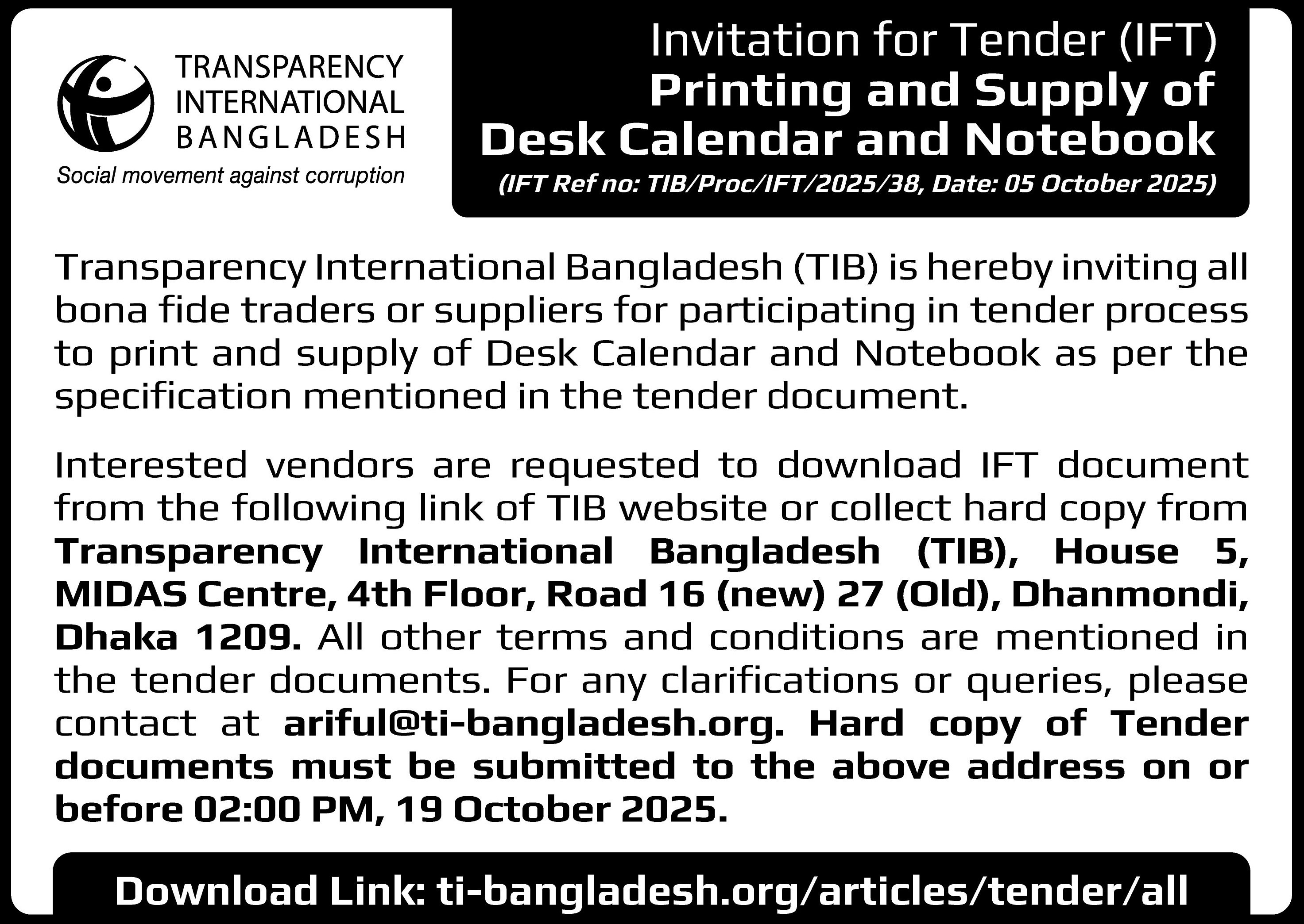 Interested vendors are requested to download IFT document from the following link of TIB website or collect hard copy from Transparency International Bangladesh (TIB), House 5, MIDAS Centre, 4th Floor, Road 16 (new) 27 (Old), Dhanmondi, Dhaka 1209. All other terms and conditions are mentioned in the tender documents. For any clarifications or queries, please contact at ariful@ti-bangladesh.org. Hard copy of Tender documents must be submitted to the above address on or before 2:00 PM, 19 October 2025.