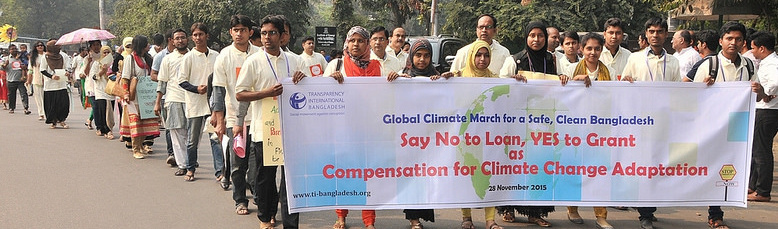 In solidarity with the global climate march that was taking place around the world, anti-corruption youth volunteers of TI-Bangladesh's Youth Engagement and Support (YES) group joined thousand other climate marchers in the capital Dhaka and in 29 locations around the country on 28 November demanding Say No to Loan, Yes to Grant as Compensation for Climate Change Adaptation. Carrying placards and banners from Central Shahid Minar and parading streets through High Court, Shishu Park and Shahbagh, hundreds of YES volunteers urged the Bangladesh delegation to strongly put forward the above demand before the World leaders who will be gathering in Paris for UN Climate Conference (COP-21) from 30 November. Youth includes YES volunteers in country's 29 locations also raised similar demand through rally and human chain.
