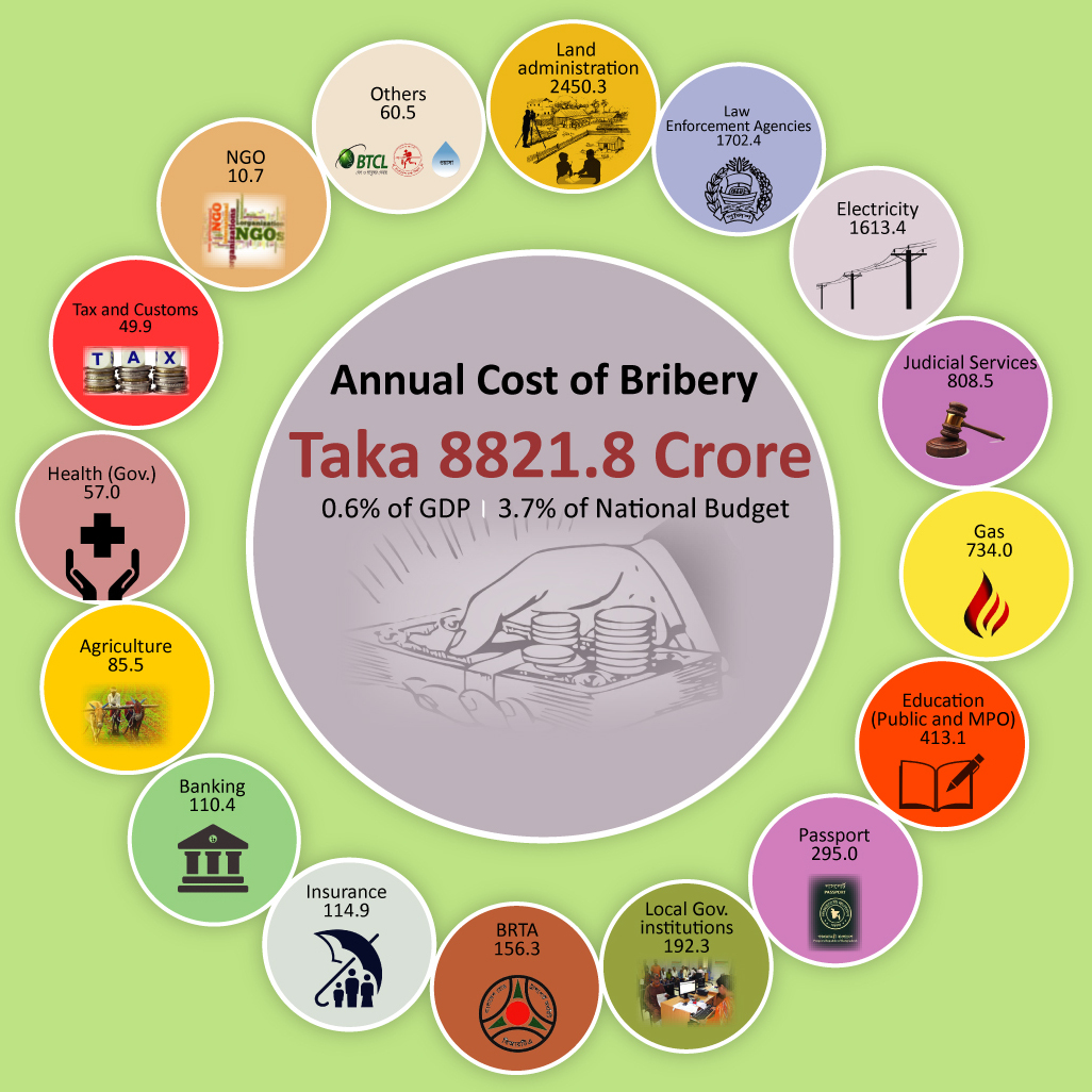 Releasing the findings of the report today in the morning at its head office here, TIB said that the national estimates of bribery is around Taka 8828 crore, which is 0.6% of 2014-15’s GDP and 3.7% of national (supplementary) budget.