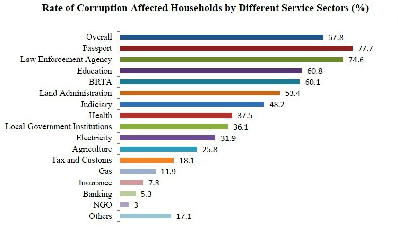 The most corrupt sectors identified in 2015 survey are: passport (77.7%), law enforcement agencies (74.6), education (Government and under MPO) (60.8%), BRTA (60.1%), land administration (53.4%) judicial services (48.2%), and Health (37.5%)_. The burden of corruption is higher on the low-income households compared to high-income households. Some 71% respondents said they had to pay bribe, because, “if we do not pay bribe, we do not get service.”