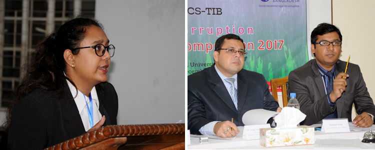 Later in the evening of the same day, a three-day anti-corruption moot court competition, first of its kind ended with the final round, the award-giving and concluding ceremony held at the Nabab Nawab Ali Chowdhury Senate Bhaban, University of Dhaka. TIB collaborated with Dhaka University Moot Court Society (DUMCS) DUMCS, the Faculty of Law, University of Dhaka for enhancing awareness among law students on anti-corruption legal regime among the students of law faculties throughout Bangladesh.