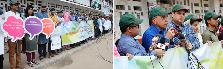 Referring freedom of expression and right to information as the fundamental rights of the people, Executive Director of TIB Dr. Iftekharuzzaman said, the Right to Information (RTI) Act is exceptional as it gives people the right to hold the government accountable and the Digital Security Act will create greater risk of insecurity not only in expressing opinion freely but also in practicing basic human rights of both the media workers and mass people if the act comes into effect without proper reviews. Speaking at a human chain organized by TIB on 26 September at Dhaka University's Teacher-Student Centre (TSC) marking the International Right to Know Day (RTK) 2018, Dr. Zaman expressed fear that wide misuse of the act by the members of the law enforcement agencies would happen as the act has given them the power to check and arrest anyone without any warrant. He added that Digital Security Act would endanger the people of their basic human rights and be an impediment to the way of flourishing democracy in the country. Terming the act as a `black law’, Dr. Zaman said, we are not opposing the act, but we are just demanding amendment to some sections. On inclusion of the colonial Official Secrets Act into the Digital Security Act, Dr. Zaman said, it is a backward thinking and a threat to investigative journalism. He hoped that the government would take steps to reconsider the act’s controversial sections. Among others, members of Dhaka Youth Engagement and Support (YES) groups and TIB staff attended the human chain.