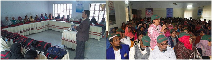 Mothers getting orientation about their roles in AMF (1); Teachers sharing their concerns and ideas (2)