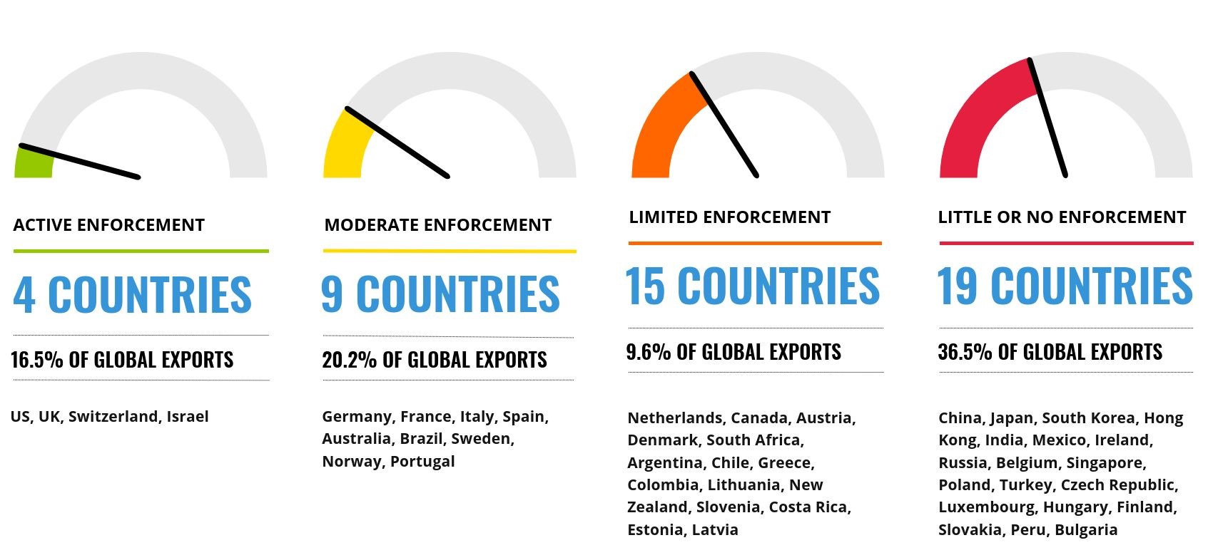 The study, “Exporting Corruption 2020: Assessing Enforcement of the OECD Anti-Bribery Convention”, conducted bi-annually by the TI Secretariat in Berlin, finds that active enforcement against foreign bribery significantly decreased since 2018. The share of global exports from countries that actively enforce against foreign bribery and related money laundering is down by more than a third. Only four out of 47 countries, which make up 16.5 per cent of global exports, actively enforced legislation against foreign bribery, compared to seven countries and 27 per cent of global exports in 2018. In fact, most countries, 34 out of 47, covered by the study conducted practically no enforcement of their relevant laws.