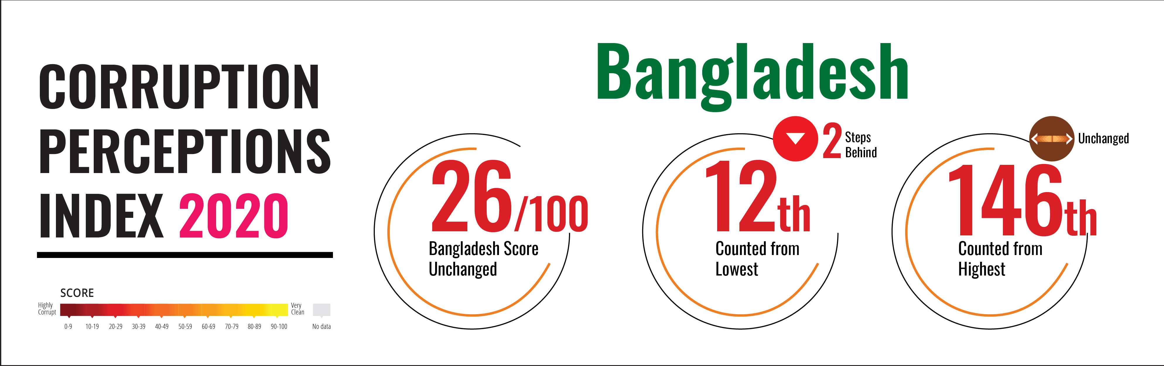 Among the eight South Asian countries, Bangladesh remains 2nd lowest in score and rank – better than only Afghanistan, which has scored 19 and ranked 165th from the top. Bangladesh’s ranking is the 4th lowest among 31 Asia-Pacific countries included in the index, better than Cambodia, Afghanistan and North Korea.