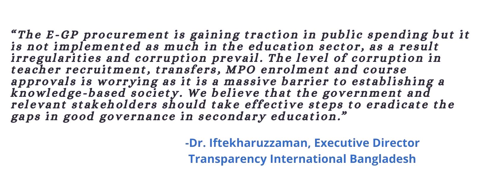The full report can be viewed here - মাধ্যমিক শিক্ষা কার্যক্রম বাস্তবায়ন: সুশাসনের চ্যালেঞ্জ ও উত্তরণের উপায়