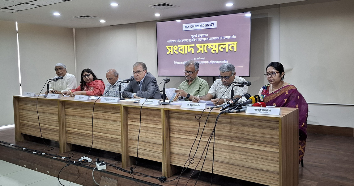 Human rights activists and civil society members unanimously called on the interim government to present a clear, time-bound roadmap for implementing the recommendations of a UN report on human rights violations during the July uprising. They said this would ensure accountability for the violations and bring about necessary reforms to state entities. These demands were made at a press conference held at the Transparency International Bangladesh (TIB) office in Dhaka, where 20 rights activists and civil society organizations, including TIB, gathered under the banner of Human Rights Forum Bangladesh (HRFB).